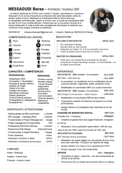 Architecte diplômée de l’EPAU avec mention 5 étoiles, spécialisée en urbanisme, je dispose d’une année d’expérience au sein de BET Bâtir et BNK Design & Construction, où j’a