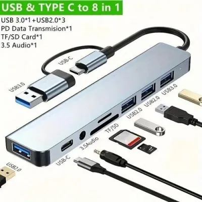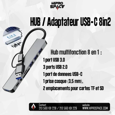 Adaptateur TYPE-C 8-en-1 – Connectivité Totale Optimisez vos appareils avec l’adaptateur TYPE-C 8-en-1, idéal pour les ordinateurs portables, tablettes et smartphones compatibles USB-