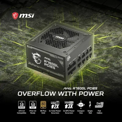 MAG A750GN PCIE5 ATX 3.1 ready, native PCIe 5.1 connector Supports NVIDIA® GeForce RTX™ 40 Series graphics cards 105°C main capacitor 80 Plus Gold certified for high efficiency with Acti
