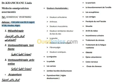 Médecin omnipraticien assermentée ( médecine générale , mésothérapie الوخز بالابر الفرنسية , ventousothérapie حجامة طبية , acupuncture الوخز بالا