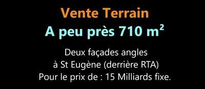 Spécialiste Affaires Immobilières vous propose en vente un terrain d'à peu près 710 m² , avec deux façades angles , à St Eugène (derrière RTA) , pour le prix de : 15 Milliards fixe.