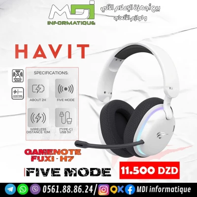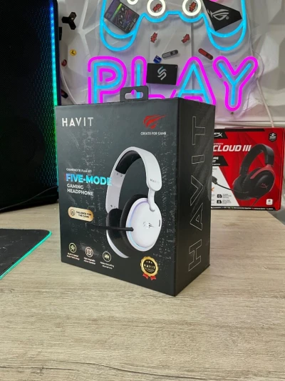 Casque Gaming Havit Fuxi-H1 Tri-Mode bluetooth (GAMENOTE) Stereo Sound Connection Modes (Bluetooth/dongle/Cable) Omnidirectional Microphone 24MS LOW latency 40MM Dynamic Unit العلب�
