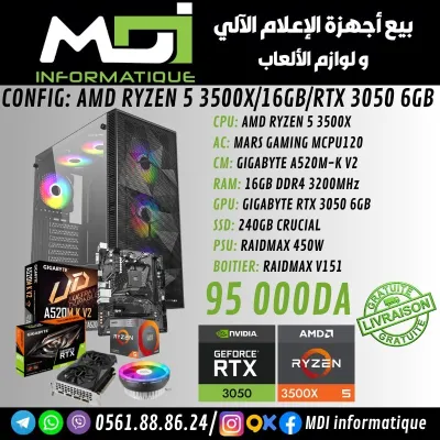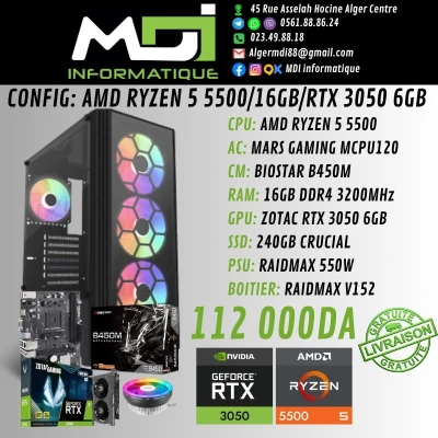 CPU: AMD RYZEN 5 5500 AC: MARS GAMING MCPU120 CM: BIOSTAR B450M RAM: 16GB DDR4 3200MHz GPU: ZOTAC RTX 3050 6GB SSD: 240GB CRUCIAL PSU: RAIDMAX 550W BOITIER: RAIDMAX V152