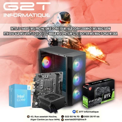 CPU: INTEL CORE i3-14100F CM: MSI H610M-E RAM: 16GB DDR4 3200MHz GPU: NVIDIA RTX 3050 6GB SSD: NVME M.2 256GB PSU: MSI 500W BOITIER: XIGMATEK GAMGING G PRO