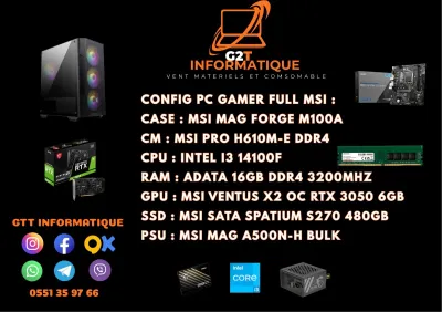 CPU: INTEL I3-14100F CM: MSI PRO H610M-E DDR4 RAM: 16GB DDR4 3200MHz GPU: NVIDIA RTX 3050 VENTUS 2X 6G OC SSD: SSD 480GB MSI SPATIUM S270 PSU: MSI MAG A500N-H BOITIER: MSI MAG FORGE M100A