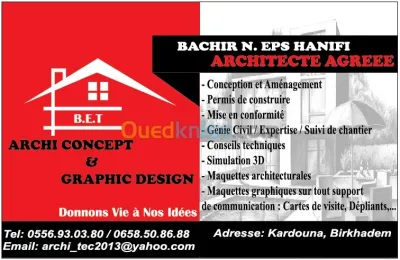 Le bureau d’étude «ARCHI CONCEPT & GRAPHIC DESIGN» est spécialisé dans tous types de travaux de conceptions et d’aménagements intérieurs et extérieurs. On vous propose nos se