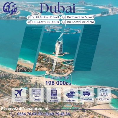 ✔ DUBAI Avril & Mai 2025 ✔ Hôtel ⭐⭐⭐⭐ DE LUXE ✔ 07 nuits et 08 jours à 185.000 Da ✔️ Le Produit inclus : ▪️ Billet ALGER – DUBAI – ALGER avec EMIRATES ▪️ Tr