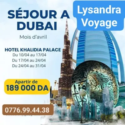 🌟 Dubaï avec Lysandra Voyage à partir de 189000Da 🌟 ________ Groupe 01 : 10/04 au 17/04 Groupe 02 : 17/04 au 24/04 Groupe 03 : 24/04 au 31/04 _________ ✅ İnclus dans le p