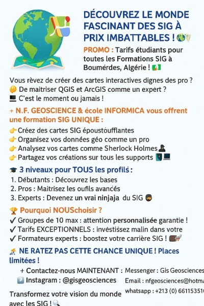 🌍 Découvrez le Monde Fascinant des SIG avec des Tarifs Exceptionnels ! N.F. GEOSCIENCE & École INFORMICA - Boumerdes, vous présente : 🎯 Formation SIG - Niveau 1 : Les Fondamentaux