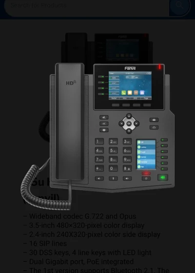 X5u High-quality IP Phone (Fanvil) – Wideband codec G.722 and Opus – 3.5-inch 480×320-pixel color display – 2.4-inch 240X320-pixel color side display – 16 SIP lines – 30 DSS keys