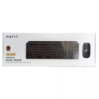 Combo Clavier Souris Sans Fil HAVIT KB836WB Description • Connectivité : Double mode – 2.4 GHz (via récepteur USB) + Bluetooth 5.1 • Portée sans fil : Jusqu’à 10 mètres •