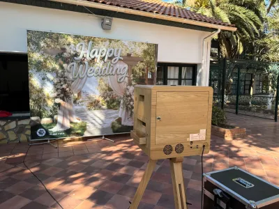 Location photobooth professionnel en bois, avec possibilité de personnaliser : - la photo - le mur press ou photocall - des pochettes photos - accessoires pour photos Avec livraison Alger