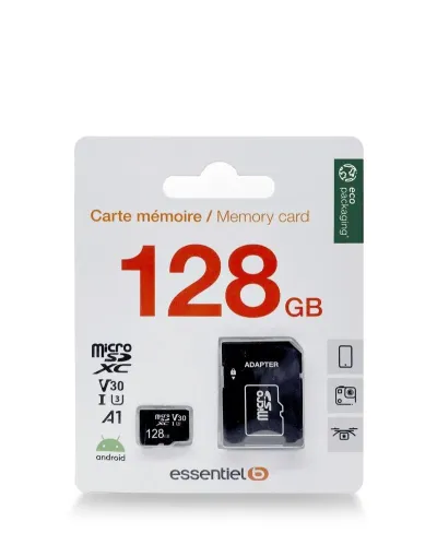 Capacité : 128 Go - Micro SDXC V30 Vitesse de lecture : 90 Mo/s Vitesse d'écriture : 50 Mo/s