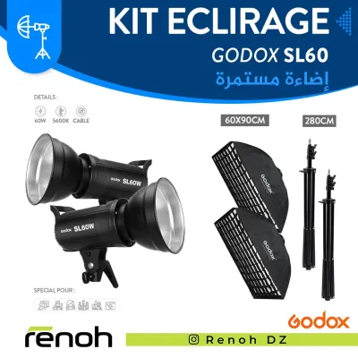 - **Liste des Produits** 2 x Godox SL-60W; 2 x Softbox Godox Rectangulaire 60x90cm à mount bowens; 2 x trépied portable pliable; Caractéristiques De Produit: - **Godox SL-60W LED
