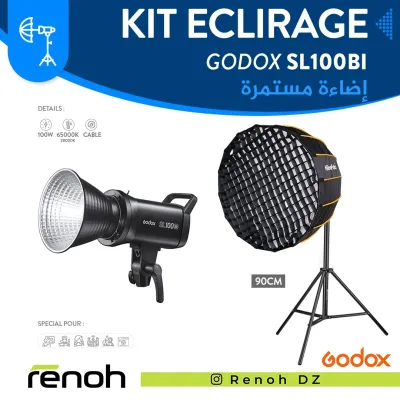 - **Liste des Produits** 1 x Godox SL-100Bi; 1 x Nicefoto 90cm à mount bowens; 1 x trépied portable pliable; Caractéristiques De Produit: - **Taille très compacte** : Godox