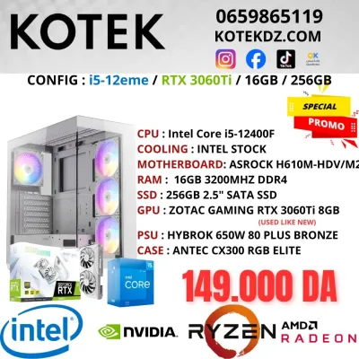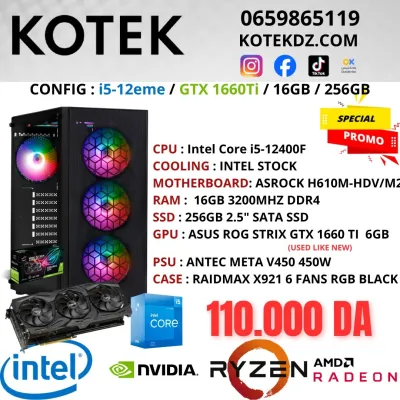 INTEL CORE I5-12400F 16GB RAM DDR4 3200MHZ 256GB SSD HIK SEMI SATA GPU:ZOTAC GAMING RTX3050 8GB BOITIER MSI 120A PSU:RAIDMAX 650W CARTE MERE MSI H610
