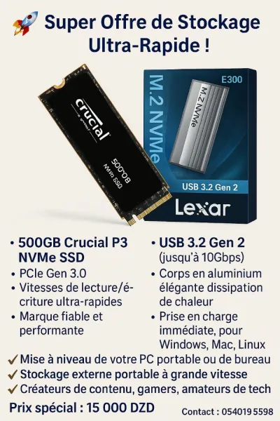 Profitez d’un pack ultra-performant avec le SSD NVMe 500GB et le boîtier USB 3.2 Gen 2 Lexar. Idéal pour gamers, créateurs de contenu et mise à niveau PC. Vitesse jusqu’à 10Gbps. L