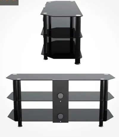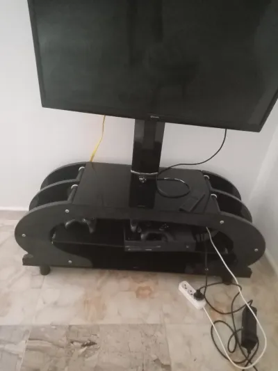 etat moyen, stable et propre. COnvient pour télé écran plat ou TV suspendue (support intégré) Détails: Verre épais et résistant Couleur : noir brillant Support mural inclus Design