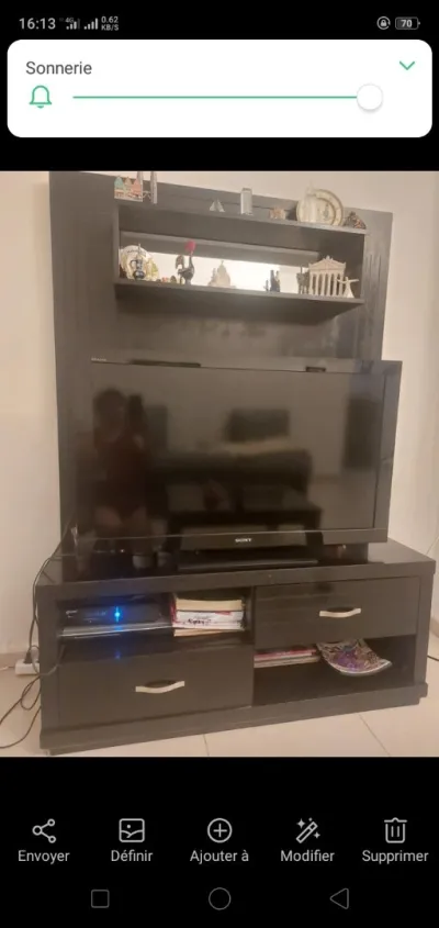 📺 Meuble TV à vendre – Occasion Meuble TV importé, en bois MDF de haute qualité. Très bon état, comme visible sur la photo. ✅ Design moderne, plusieurs espaces de rangement 📏