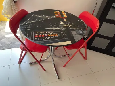 Table à manger ronde avec comme motif New York 2 chaises confortables rouges Bon état Meuble importé de France