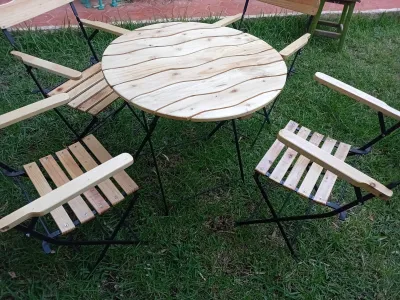CHAISE BISTRO AVEC ACCOUDOIR PLIABLE A BASE DE BOIS ROUGE ET PIED EN ACIER TABLE RONDE PLIABLE 80 CM DE DIAMETRE SI VOUS ETES INTERESSE SUR COMMANDE COULEUR ET DIMENSION A VOTRE CHOIX