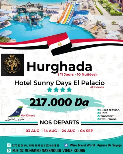 🌴🔴 Hurghada VOL DIRECT ✈ avec Air Algérie ✨🔴 a partir de 214 900 DA Séjour de rêve 👇👇 Hôtel 5* étoiles en All Inclusive 🔥 --------Nos Départs : Du 26/07 Au 04/