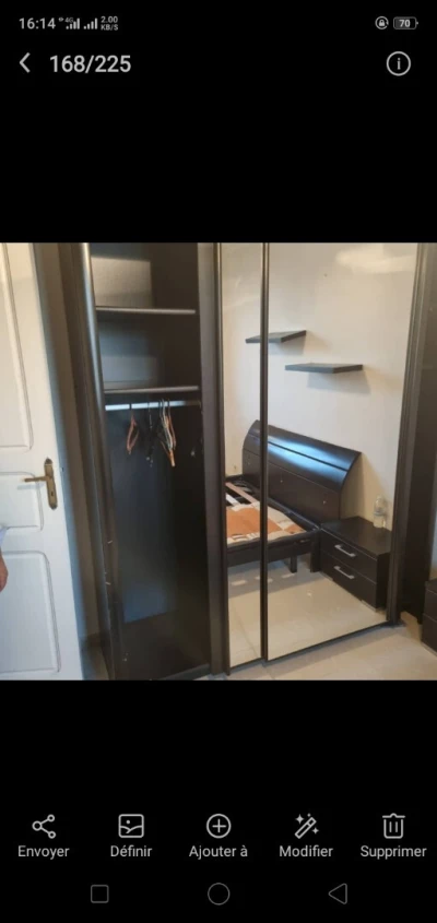 Je mets en vente une chambre à coucher complète, soigneusement entretenue et en très bon état. Ensemble moderne, pratique et spacieux 1. Armoire coulissante de grande capacité Lo
