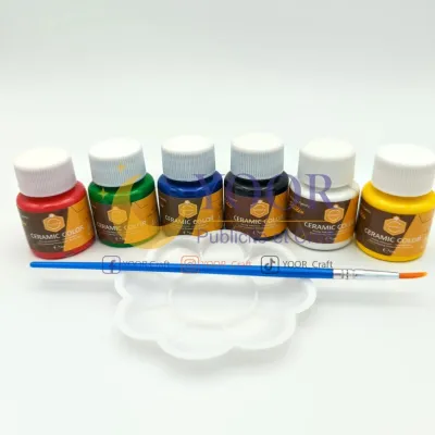 الطقم يتكون من 6 ألوان اساسية، بالإضافة الى فرشاة رسم و لوحة مزج اكتشف مجموعة الرسم على السيراميك للمبتد�
