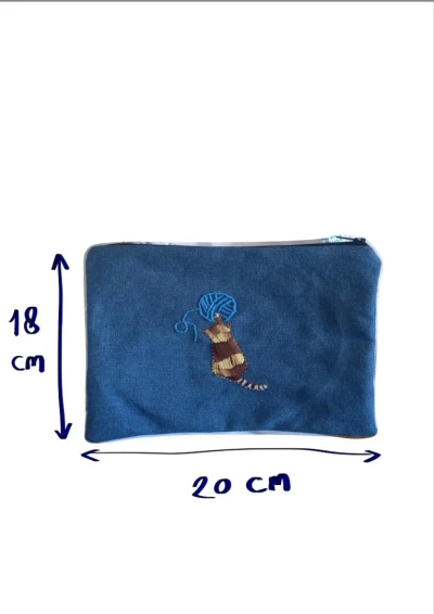 Pochette en jean chat de broderie pour crayons et maquillage multifonction Hauteur 18 cm Largeur 20 cm couleur bleu