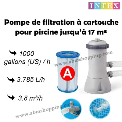 Débit filtration: 3,785 L/h – 1000 gallons (US) / h – 3.8 m³/h Idéal pour les piscines jusqu’à 17 m³ (600 Pieds). tuyaux diamètre 32mm. Puissance : 99W. Cartouche A incluse. Po
