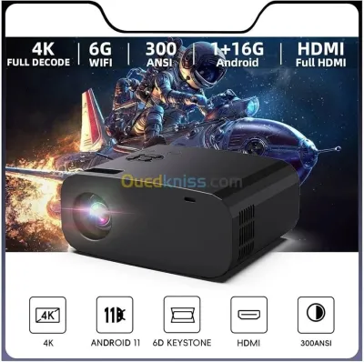 ضمان 06 أشهر Décodage complet 1080P 4K 300 ANSI avec haut-parleur HIFI 5W Système Android 11.0 1 + 16g, Support:Wifi 6 2.4G/5.8G Dual Wifi support BT 5.0 Écran de projection