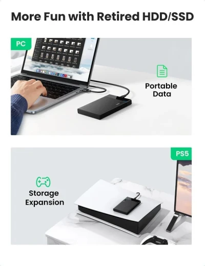 Product information Transformez vos disques 2.5" ou 3.5" HDD/SSD en stockage externe rapide avec le UGREEN US222-50422. L’interface USB 3.0 assure un transfert de données rapide et stabl