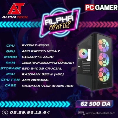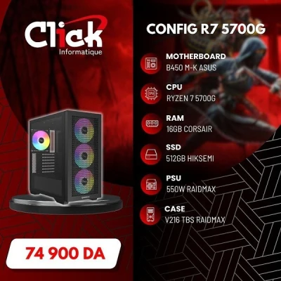 ✅ CPU: RYZEN 7 5700G ✅ CARTE MERE: B450 M-K ASUS ✅ RAM: 16GB RAM CORSAIR ✅ SSD: 512 SSD HIKSEMI ✅ ALIMENTAION: 550W RAIDMAX ✅ BOITIER: RAIDMAX V216 TBS