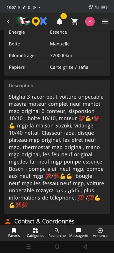 Voiture unpecable 3 petit des racor voiture mzayra , moteur complet neuf mahtot 0 conteur, vidange neuf,la chaîne neuf tandeur neuf,bougie neuf,faiso neuf, tout original mgp,les direct neuf