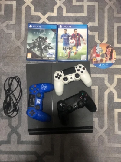 PS4 Fat ✅ 3 jeux Destiny 2-GTA V-Fifa 15✅ 2 manette V1 original ✅ 1 manette v2 original(problem joystick)❌ Hab6a kaba ✅jamais ouvert ✅