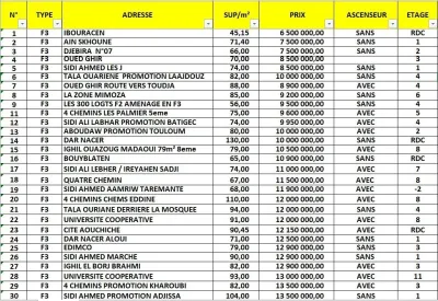 Groupe Houari Immobilier vend plusieurs F3 à différents prix, endroits et superficies NB : voire les 02 tableau du disponible