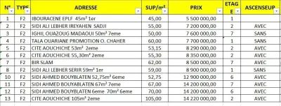 Groupe Houari Immobilier vend plusieurs F2 voir le tableau ( différents prix, endroit et superficies ) NB : les photos et Vidéos sur Viber et WhatsApp