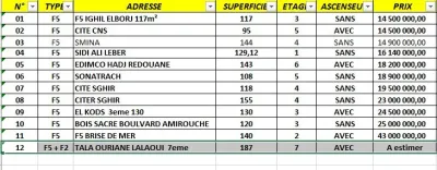Groupe Houari Immobilier vend plusieurs F5 à différents prix, endroits et superficies NB : voire le tableau du disponible
