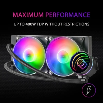 ML-LCD360 Liquid Cooling ARGB The AIO ML-LCD360 liquid cooling system is the perfect combination of efficiency and style. With three 120 mm FDB fans with ArgB lighting, it guarantees a highe