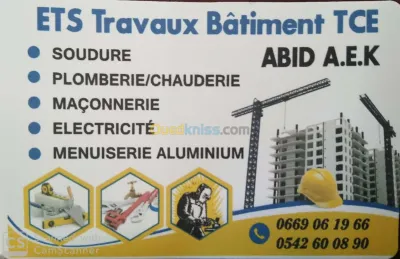 bonjour entreprise de travaux bâtiment (T.C.E) plus de 18 ans dans le domaine,prend touts travaux de construction finition brique enduit ciment Dalle de sol faïence peinture BA13 plomberie