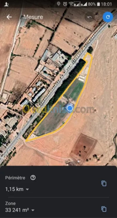 24 hectares dont 14 cultivables et 3 ha d'oliviers à huile0. Au bord de la route nationale Aflou-Laghouat. Une maison R+1 80 m2 au sol Un hangar de 120 m2 environ Une cour clôturées par d