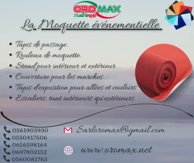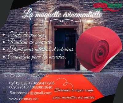 🔷 Moquette événementielle – Sarl OROMAX Valorisez vos événements avec une moquette de qualité professionnelle, adaptée à tous types de réceptions : salons, expositions, inaugura