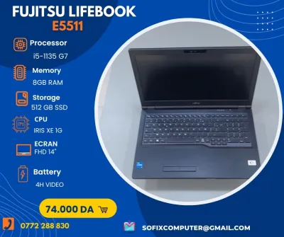 Disponible chez #Sofix computer plusieurs modèles et configurations une garantie de 6 mois LAPTOP FUJITSU LIFEBOOK E5511 I5-1135 G7 8G 512G SSD 15,6". CPU: Intel I5-1135 G7 11éme générat