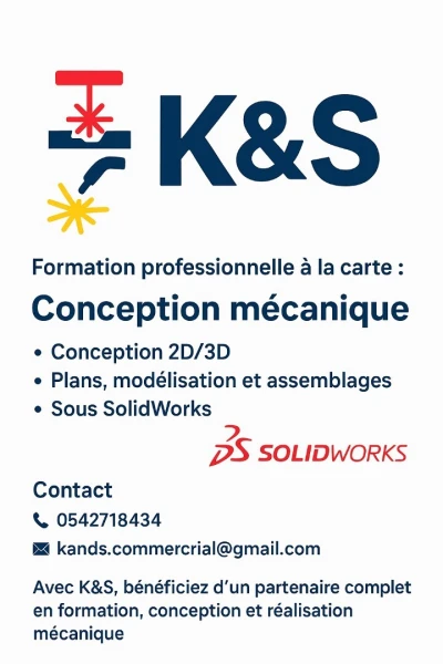 🎓 Formation professionnelle à la carte 🔧 Conception mécanique Conception 2D/3D Plans, modélisation et assemblages Réalisée sous SolidWorks 📞 Contact Téléphone : Email