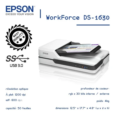 pson Scanner Workforce DS-1630 A4 1200dpi *CARACTÉRISTIQUES : • Capacité de stockage de documents : 50 feuilles • Taille maximale de document : 216 mm x 3048 mm • Type de chargeur d
