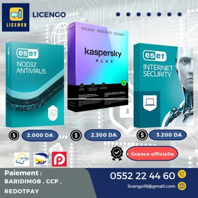 Licences officielles : Microsoft Office 2021= 1.400 DA Microsoft Office 2024 =2.000 DA ESET NOD32 (02 ans)= 1.800 DA ESET internet security = 2250 DA Adobe creative cloud - 1 mois (3.200