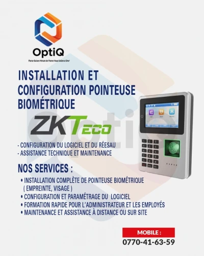 - INSTALLATION COMPLETE DE POINTEUSE BIOMETRIQUE ( EMPREINTE, VISAGE ). - CONFIGURATION ET PARAMETRAGE DU LOGICIEL - FORMATION RAPIDE POUR L'ADMINISTRATEUR ET LES EMPLOYES. - MAINTENANCE ET