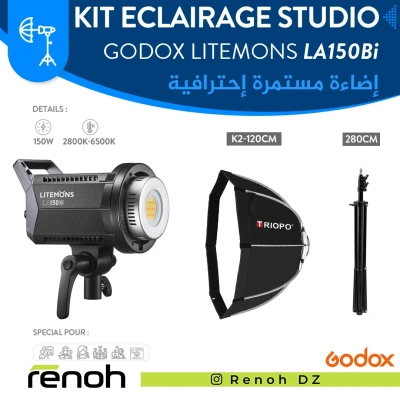 Kit Contient: - 1x Lumiére Continue COB GODOX LITEMONS LA150Bi. - 1x Softbox TRIOPO K2-120cm. - 1x Trépied Lumiére 280CM.