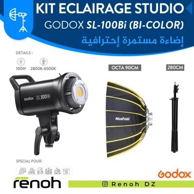 Kit Contient: - 1x Lumiére Continue COB GODOX SL100Bi. - 1x Softbox Octagonal Nicefoto 90cm. - 1x Trépied Lumiére 280CM.