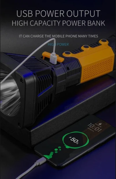 Torche LED et Power Bank avec Guirlande RGB 10m – مصباح طورش عالي السطوع Model: W5187-1 model with colored lights Light bulb: P50 Luminous: Strong level 1500 Lm; Mid ran